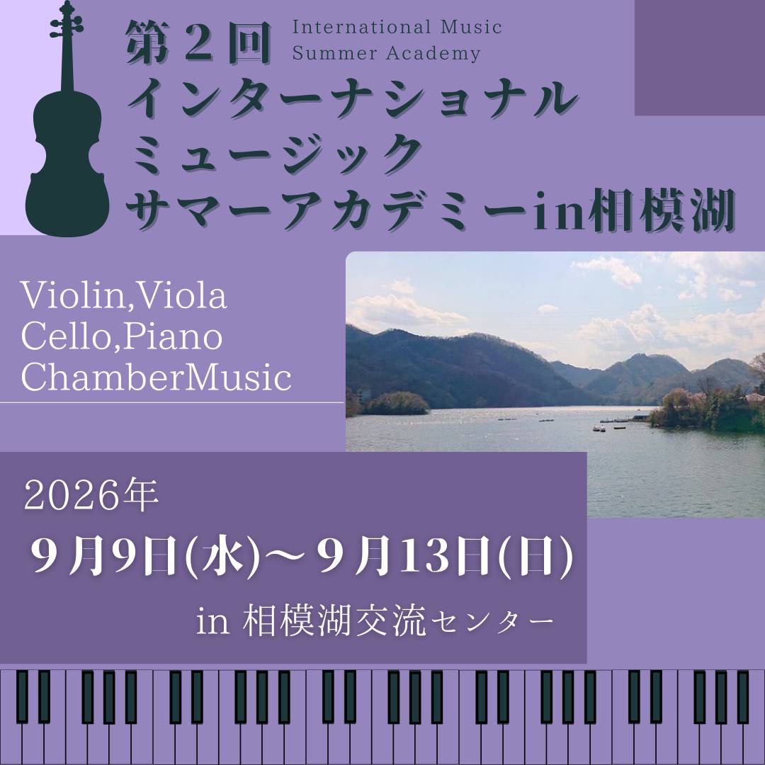 From 10 to 15 September, the First International Summer Academy in Lake Sagami will be held at the Sagamiko Koryu-Center in Kanagawa, Japan. The programme includes private lessons on piano, violin, viola and cello, as well as a chamber music lessons in which students can play along with the professors. In addition, there will be a concert by the professors during the festival and also a concert by the students at the last day of the festival. Lessons will be given by world-renowned performers and professors from international music academies.